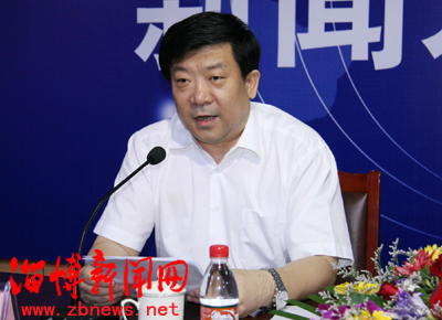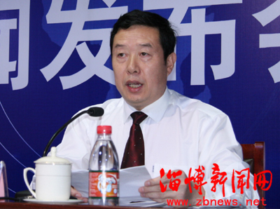 淄博市委宣傳部常務副部長、市社科聯黨組書記趙新法主持發(fā)布會。