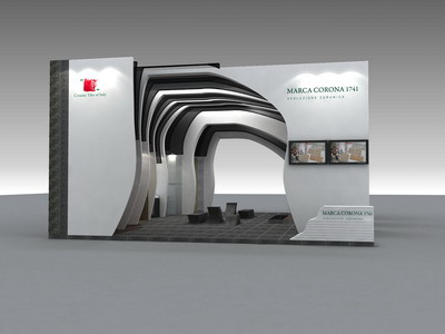 這次的展位設(shè)計將東西文化巧妙融合,結(jié)構(gòu)上黑白搭配、動靜結(jié)合,營造出一種極富藝術(shù)魅力的空間氛圍,給人穩(wěn)重、大氣而典雅的感覺。展位外觀方正,體現(xiàn)東方人的嚴謹和內(nèi)斂;內(nèi)部采用流線型布置,體現(xiàn)西方人的浪漫和奔放;加上頂部空槽的燈光設(shè)置,塑就一種華麗而開放的意象。展臺外觀采用純白材料,給人高檔而整潔的感覺;地臺采用Marca Corona最新出品的reaction系列的rea.black (120*60)地磚,彰顯出一種穩(wěn)重而典雅的氣質(zhì)。內(nèi)墻面的貼磚是 Alchimie系列的 alc.Star 3949 ( 44.5*44.5),四塊磚拼結(jié)時中間的共同角略向外掀起,這種風格在國內(nèi)僅此一家。整個設(shè)計完美地體現(xiàn)出Marca Corona的品牌特點。