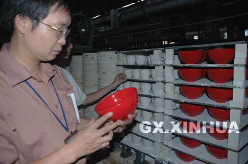 9月14日,陶瓷生產(chǎn)企業(yè)廣西三環(huán)企業(yè)集團(tuán)分公司的一名技術(shù)人員正在檢查產(chǎn)品質(zhì)量。