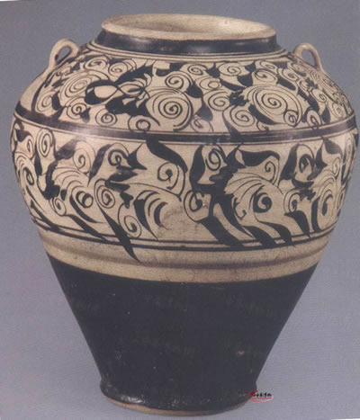 元 耀州窯白地黑花瓷壇 說明: 高36.1厘米,口徑16.2厘米,底徑13.3厘米 這件元代耀州窯白地黑花瓷壇,高36.1厘米,口徑16.2厘米,底徑13.3厘米。壇口為圓唇,口沿微斂,豐肩,深腹,肩以下漸內(nèi)收,圈足。肩兩側(cè)對稱飾雙系,以雙泥條捏塑而成。肩、上腹繪黑色花紋兩層,線條流暢,黑彩上罩以透明釉,白中閃黃;下腹與器內(nèi)滿施黑釉,下底無釉。此壇形體碩大渾圓,花紋飽滿,是元代耀州窯瓷器中的精品。     現(xiàn)藏于甘肅省博物館。
