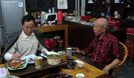 中國工藝美術(shù)大師劉遠(yuǎn)長(右)接受中國經(jīng)濟(jì)時(shí)報(bào)記者(左)采訪