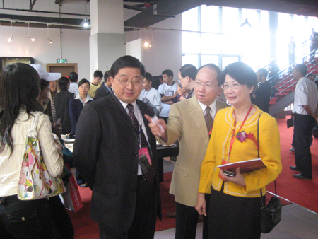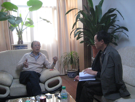 中國工藝美術(shù)大師王懷。ㄗ螅┙邮苤袊(jīng)濟(jì)時(shí)報(bào)記者(右)采訪