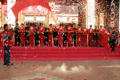 在開業(yè)儀式中,主會場正面矗起的一座20米紅門、一對紅燈籠柱、側(cè)面矗起的二座18米彩虹門、二對燈籠柱以及三座高大鮮艷的彩虹門宛如一條絢麗的彩虹,宏偉壯觀。此外,在會場周圍停放10臺加長林肯車隊,氣勢磅礴、壯麗巍然,車體上方掛有條幅,車體顏色一致就像路標,不但為參加典禮的領(lǐng)導(dǎo)與來賓指引方向,而且讓活動整體有序。整個開業(yè)儀式豐富、生動、多彩,現(xiàn)場在噴射出五彩繽紛的彩片而產(chǎn)生從天而降的完美畫面下,獨樹一具的開業(yè)氣氛吸引了近千人前來觀摩及采購,同時,也以隆重?zé)崃、格調(diào)高雅、氣勢非凡的開業(yè)儀式展現(xiàn)益高公司的雄厚實力,提升了EAGO(益高)在哈爾濱市及黑龍江省的品牌知名度,并快速占領(lǐng)市場打開全方位的銷售局面,將“中華第一店”做到名副其實,為黑龍江經(jīng)濟騰飛做出更大貢獻打下了良好的基礎(chǔ)。