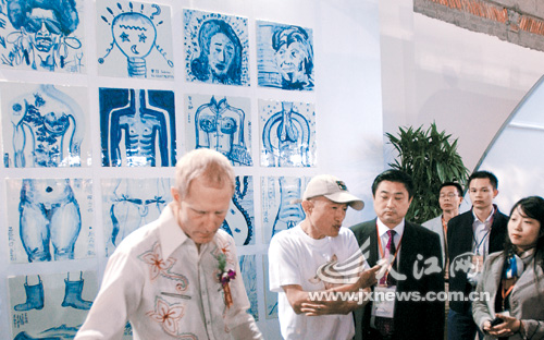 這組青花瓷版畫(huà),是由中國(guó)和荷蘭四位藝術(shù)家“四步蛇”共同創(chuàng)作的。當(dāng)一個(gè)藝術(shù)家描繪形體的一部分時(shí),用紙遮蓋住先前藝術(shù)家已描繪的圖案。這種不看前者畫(huà)面的創(chuàng)作方法,充分發(fā)揮了藝術(shù)家的個(gè)人風(fēng)格,多視角展現(xiàn)藝術(shù)家的內(nèi)心世界和對(duì)社會(huì)的關(guān)注。