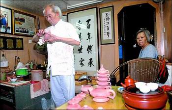 73歲陶瓷藝術大師吳瑞深(左)技藝精湛,他創(chuàng)作的潮州手拉朱泥壺得到國內(nèi)外客商的青睞,也使更多的人領略到潮州陶瓷的深厚底蘊。