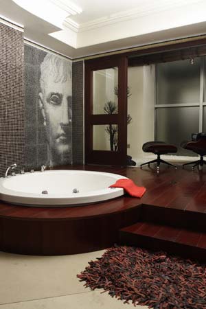 區(qū)域:衛(wèi)生間干濕分區(qū)采用不同顏色但是同為冷色系的馬賽克進(jìn)行分離,浴缸區(qū)即濕區(qū)整面墻和缸臺均采用大面積黑色馬賽克,與白色浴缸相搭配,營造出莊重典雅的效果