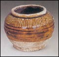 元代時期的黑釉瓷有碗、碟、杯、高足杯、罐、黑釉彩繪折唇盆、扁腹壺、鼎、器蓋、鏤空爐和褐釉柳斗紋罐等。碗盞、杯多芒口,腹斜削,較粗糙。折唇盆這種胎型裝飾為宋代所不見,與元代仿銀器作風近似。長頸瓶元墓常有出土。黑釉瓶與元代梅瓶風格接近。各式器蓋和白色乳釘紋作風以及鏤空和半環(huán)形小鈕裝飾在南朝鮮海域中國元代沉船的大批元瓷中已有發(fā)現(xiàn)。荷葉形器蓋也是元代瓷器盛行的一種。總之吉州窯黑釉瓷器經(jīng)歷了北宋、南宋和元代3個不同時期,延續(xù)時間較長,形制也略有變化。