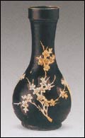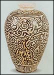 為月光底下的梅樹、竹枝、飛蝶或風雪中的蘆花,有含蓄的風味和濃厚的國畫意境,開創(chuàng)了釉上彩繪的先河。在文字裝飾上,有壓印、彩書"吉""記"、"福"、"慧"、"太平"、"粉合十分"、"尹家個"、"本覺"、"舒家記"或剪紙"金玉滿堂"、"長命富貴"和"福壽康寧"等,表達了民間習俗和向往美好康樂的愿望。黑釉剔花填釉折枝梅裝飾,迎雪盛開,別具雅趣。簡練的刀法,剔畫得形神兼?zhèn)洹?br />