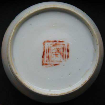 鑲底 器物底部損壞后,在器底近釉處精密游切,用同類品或其他合適的底足與之鑲接,一般不易顯露痕跡。如康熙器的二層臺階底處的接痕,更不易被發(fā)現(xiàn)。還有一種情況是將新、舊器的底取下,特意改裝,換鑲其他合適的且?guī)Ч俑G款的舊器底,以混充真品,這也是后加款中嵌底款的辦法之一。但往往會將瓶底款與碗、盤底款互用,而露出馬腳。一般講,琢器(如罐、瓶、爐等)的底款書寫得比較緊湊,而圓器(如盤、碗等)款則疏散,且雙圓環(huán)開闊;琢器底款外圍小,圓器底款外圈大。