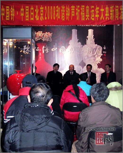 【德化網(wǎng) 訊】 記者從12月28日上午在北京大鐘寺古鐘博物館舉行的新聞發(fā)布會上了解到,“和諧鐘聲、祈福奧運(yùn)”中國鐘·中國白2008北京鳴鐘祈福奧運(yùn)年大典暨中國瓷都·德化陳仁海中國白藝術(shù)展即將于2008年元旦零點(diǎn)時(shí)刻舉行。