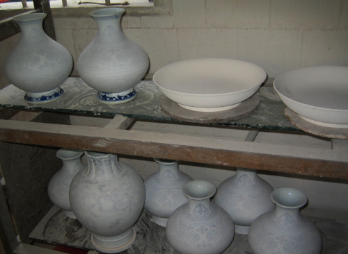 環(huán)節(jié)三:寫款 |款識的書寫到位與否對于一件高仿瓷的成敗極為關(guān)鍵。如果說樊家井、老鴉灘一帶的普通寫款師傅行情是一個(gè)款識一二十元,那么羅家塢等地的高仿寫款師傅則可以拿到一個(gè)字20元的報(bào)酬,也就是說,請一個(gè)高仿寫款師完成一個(gè)類似“大清乾隆年制”的六字款識,需要花費(fèi)120元。千萬不要小看這120元的花費(fèi),這僅僅只是燒窯之前每件瓷器的付費(fèi),而每一次柴窯最終能燒制成功、模仿到位的精品不會超過5%,如果以每20件燒成功1件來計(jì)算,相當(dāng)于每件燒制成功的高仿瓷背后需要花費(fèi)高達(dá)2400元的款識費(fèi)用,這是一筆驚人的開支。 環(huán)節(jié)四:特殊呈色效果的形成 礦料的配方、釉層的厚薄、用料的多寡、火候的高低,甚至窯位的差別,都會造成瓷器最終呈色效果的千差萬別。高仿藝人往往根據(jù)仿制的需要,采取不同的措施來獲取特殊的呈色效果。 以仿制元青花為例,在今天已經(jīng)沒有當(dāng)年進(jìn)口鈷料、只能采用低鐵高錳的珠明料的情況下,高仿藝人首先需要在顏料中添加一些含鐵的礦物質(zhì)以造成明顯的鐵銹斑效果,并且還要保證最終的青花發(fā)色到位,這并非易事。其次,在一些需要造成鈷料暈散流淌效果的位置,往往通過在繪制的過程中采用局部加重顏料,或是吹釉時(shí)厚薄有所區(qū)分的方法,等等。 燒制前常溫狀態(tài)下的釉往往呈現(xiàn)出與燒成后截然不同的色彩,那些白色的釉就可能會是用于青花等釉下彩瓷的透明釉,而看上去呈粉紅色的釉則有可能是青釉。釉對瓷器最終呈色效果的影響極大。仍以青花瓷器舉例,鈷料如若失去透明釉的保護(hù),燒成后就是黑色而非藍(lán)色(康熙朝的粉彩和五彩等釉上彩瓷開始采用在釉上繪鈷料造黑色效果的方法);而透明釉如果施薄了,很可能這件青花的發(fā)色就會發(fā)烏“發(fā)枯”(即釉面不滋潤),碰到這種情況,藝人往往選擇重新施釉后“復(fù)火”的方法以達(dá)到更佳效果;若透明釉施厚了,則又會讓鈷料暈散流淌,或出現(xiàn)“朦花”(筆者注:指釉下的青花紋飾不能清晰顯現(xiàn),仿佛在雪里一般)。由此可見,施釉水平的高低對于一件仿古瓷最終能否成功呈色是非常重要的。 幾件發(fā)色不理想的青花瓷,重新施釉后等待“復(fù)火” 此主題相關(guān)圖片如下: