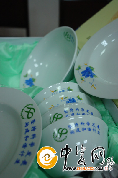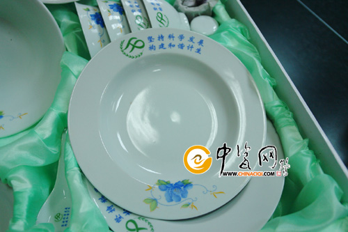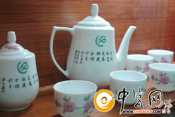 這批陶瓷包括茶具、餐具、筆洗等五個(gè)系列,共有16套。其中一套茶具以“水點(diǎn)桃花”為畫面,壺體印有“堅(jiān)持科學(xué)發(fā)展構(gòu)建和諧計(jì)生”字樣。