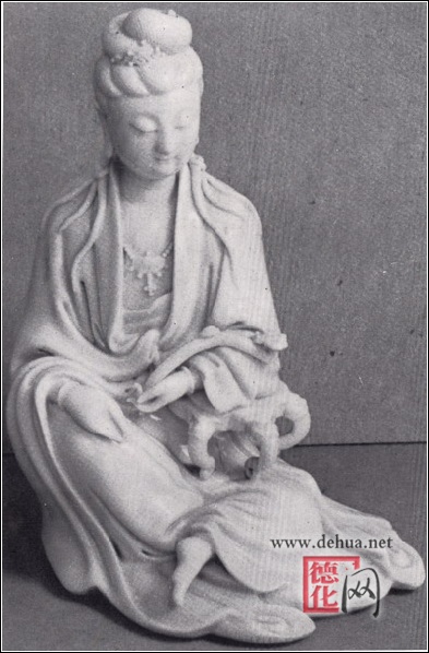 觀音像是德化窯的常見(jiàn)題材之一,何朝宗則是明代中后期德化窯瓷塑名家,最善于用表情傳神以及用流暢的衣紋展現(xiàn)風(fēng)姿。完全中國(guó)化了的觀音,其靜美柔曼的風(fēng)韻以德化瓷細(xì)膩的質(zhì)地和獨(dú)特的象牙白來(lái)表現(xiàn),在作者出色的創(chuàng)造中更顯得恰當(dāng)不過(guò)。倚著獸頭憑幾,手持如意,非屬“觀音菩薩三十三現(xiàn)”中的一種——明清時(shí)代的觀音不僅早已改變了性別,其形象距離佛典教義也已經(jīng)很遠(yuǎn),而多半只是人們賦予了想像和期待的美善與圣潔的化身。