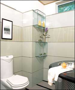 整體風格:因為衛(wèi)生間本身不大,所以這套衛(wèi)生間的墻面采用了高反光的玻璃材質(zhì),地面也用了高拋光的瓷磚,配合以明亮的燈光,衛(wèi)生間看起來大了不少。不銹鋼的面盆、龍頭、透明的淋浴間使整個衛(wèi)生間極富現(xiàn)代感。
