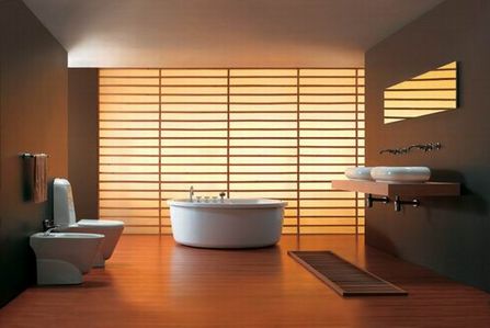 奢華空間 圓形的臺盆和浴缸給人以奢華的感覺,木質(zhì)的踏板和移門設(shè)計(jì),給人以濃重的懷舊感。
