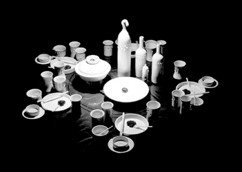 第二件作品的產(chǎn)生來自第一件的啟發(fā)。兩組造型是完全相同的,但放棄了原來以盲文的形式來呈現(xiàn)障礙這個主題。作品完全用雪里白釉噴制而成,純粹的造型上出現(xiàn)了凹凸不平并有刺傷皮膚和口唇可能的堅硬的肌理。確切地說,這一組器皿是無法使用的,令人寒冷、顫抖。迷戀宴席的人們強(qiáng)烈的心理反應(yīng)可能迅速形成,或?qū)е卵獕捍蠓壬呋蛳陆怠?br />