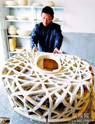 景德鎮(zhèn)新都陶瓷園的工作者昨天在制作陶瓷“鳥巢”坯子。江西景德鎮(zhèn)新都陶瓷園的工作者將燒制中小型陶瓷“鳥巢”,幾種陶瓷“鳥巢”的直徑分別為72厘米、36厘米和25厘米!