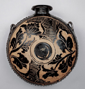 圖中這件扁壺小口、卷沿,口沿一側(cè)有堆刺紋,肩部二系。腹部扁圓,正面是褐釉剔刻的兩組牡丹花紋,背面有圓形圈足,側(cè)邊緣還有仿自皮囊壺縫線的堆刺紋。