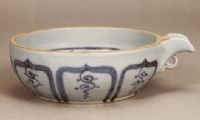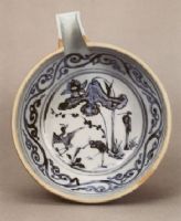 說(shuō) 明: 口內(nèi)斂,淺腹微鼓,無(wú)釉平底。內(nèi)外繪青花,色澤灰黑。