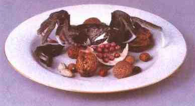 真實(shí)模仿植物或動(dòng)物形象的陶瓷制品。歷史上特指供陳設(shè)觀(guān)賞的仿制盤(pán)裝花果。宋代吳自牧《夢(mèng)梁錄·四司六局筵會(huì)假賃》即記載有“果子局,掌裝簇釘盤(pán)看果,時(shí)新水果……象生花果”。中國(guó)陶瓷史上,清初江蘇宜興窯始用各色紫砂泥制作紫砂象生器,開(kāi)象生瓷制作的先河。到了乾隆時(shí)期,景德鎮(zhèn)唐窯陶工熟練掌握了釉、彩配方及燒窯技術(shù),可隨心所欲地仿制各種物品。乾隆唐窯象生瓷有象生果品蟹盤(pán)、象生果品高足盆、仿雕漆錦紋果品盤(pán)等,盤(pán)內(nèi)盛有螃蟹、紅棗、花生、荔枝、菱角、蓮子、核桃、兩瓜子、栗子、荸薺、石榴、櫻桃、桑椹、桔子等。這些物品均與盤(pán)連燒在一起,形態(tài)、質(zhì)感維妙維肖,技藝之精已臻巧奪天工之境。除上述物品,尚有海螺、蚌、蝦、雞、鴨、象、鶴、殘荷、靈芝等。造型、質(zhì)地模仿準(zhǔn)確,達(dá)到亂真的程度。乾隆時(shí)的象生瓷,是唐窯專(zhuān)門(mén)為宮廷生產(chǎn)的高級(jí)陳沒(méi)品和沉賞玩品,由于仿肖逼真,不會(huì)干癟變質(zhì),可供皇帝和后妃們隨時(shí)觀(guān)賞,因而深受喜愛(ài)。(見(jiàn)下圖)