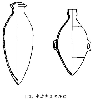 新石器時(shí)代陶器,仰韶文化半坡類型最具代表性的器物之一。汲水器。紅陶質(zhì),手工制作。器形為小直口,細(xì)頸,長圓腹,尖底.肩部或腹部有對(duì)稱的雙系,用以穿繩。器表多有繩紋。燒結(jié)程度較好,質(zhì)地堅(jiān)實(shí)。汲水時(shí)由于重力作用,瓶口會(huì)自然向下,待水將滿時(shí),瓶身自動(dòng)倒轉(zhuǎn),口部向上。仰韶文化廟底溝類型及馬家窯文化遺存中發(fā)現(xiàn)的尖底瓶略有不同。廟底溝類型的尖底瓶為雙唇,小口,器身瘦長,肩腹部無系。馬家窯文化的尖底瓶為侈口,直頸,折肩,腹有雙系,以細(xì)泥橙黃陶制成,器表涂淺紅色陶衣,以黑彩繪旋紋,紋飾充滿動(dòng)感,制作精細(xì)。(見圖112)