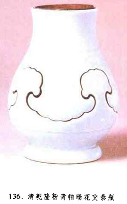 清代流行的一種瓶式。器腹中段鏤雕成如意頭形。套鉤回紋或倒、正T形。瓶體上下于紋飾間相互鉤套、連為一體,可以活動(dòng)卻不能分開(kāi),寓意“天地交泰”,為清代乾隆早期御窯廠督陶官唐英和催總老格刻意制作專供乾隆皇帝玩賞的佳器。(見(jiàn)圖136)