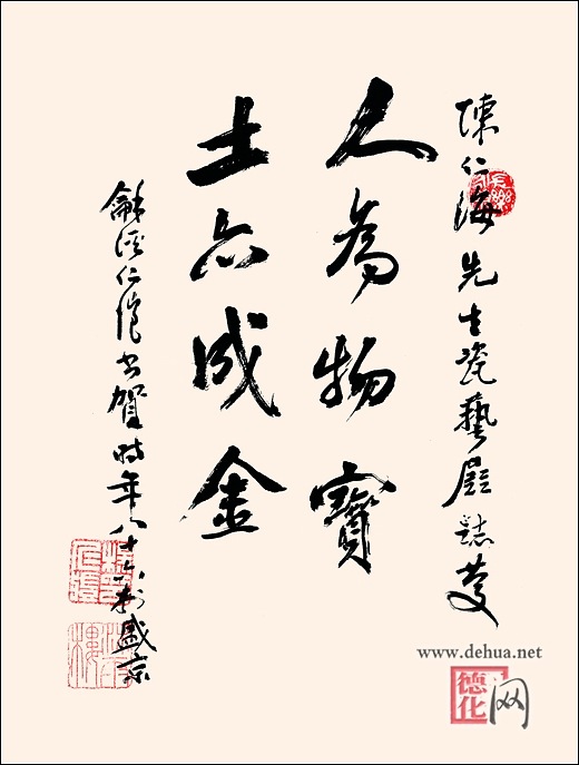 沈陽故宮博物院老院長、國家文物鑒定委員會副主任楊仁愷先生八十六歲時給陳仁海題詞:“人為物寶,土亦成金”。楊老的題詞,既精辟的道出了藝術價值的決定因素是人,是夠得上“物寶”的人,又精煉的概括了陳仁海成就藝術高峰的內(nèi)在原由。