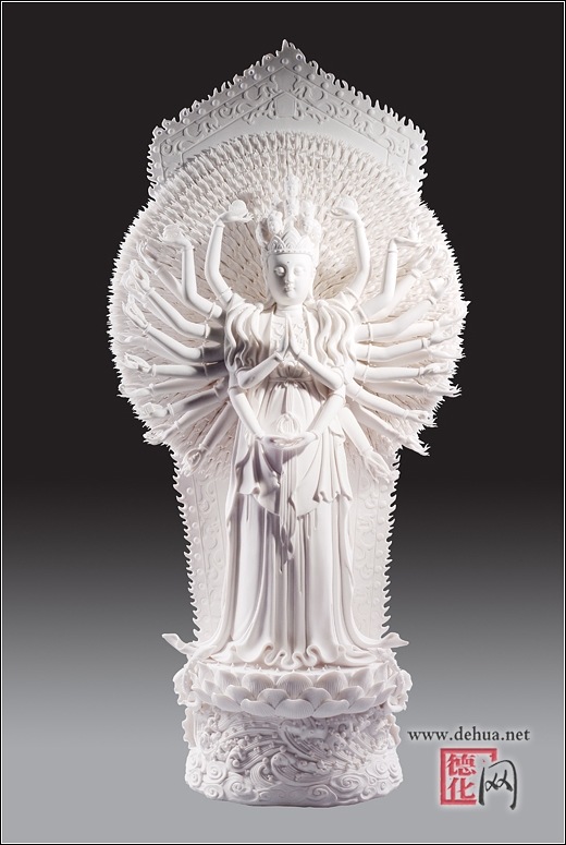 例如,陳仁海2006年創(chuàng)作的《千手觀音》瓷雕,88厘米的觀音,立于42厘米的蓮座上,體態(tài)豐腴,百如滿月,鼻梁隆起接額部,形成柳葉的彎眉。上下眼瞼飽滿,眼角下垂,千手栩栩如生,雙耳幾垂及肩,小口微含笑意。觀音細(xì)發(fā)如絲,均根根到底,無一錯(cuò)亂。觀音寶冠兩側(cè)各有一根飄帶由肩垂下,與飄拂的長袖蜿蜒曲折至蓮座,頗有“吳帶當(dāng)風(fēng)”之韻。整座雕像精巧細(xì)致,神態(tài)如生,蘊(yùn)含著高深莫測、令人肅然起敬的神秘感。此作品被故宮博物院陶瓷名家葉佩蘭研究員贊賞為“天工造化,中華瑰寶”,是價(jià)值連城的永世珍寶。