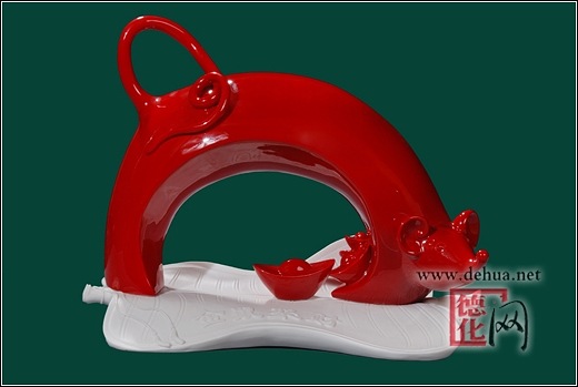 又例如:陳仁海設計制作的2008年鼠年紀念瓷,一款以端坐在似鳥巢又似元寶之上的“鼠擊鼓而樂”為造型,通體潔白如玉,取名“子來福到”,名自《詩&S226;大雅&S226;靈臺》:“經(jīng)始勿亟,庶民子來”,謂民心歸附,如子女趨事父母,不召自來,表達了全國上下萬眾一心,共建和諧社會的生動局面;一款以卡通紅鼠聚財為造型,作品主體紅如火焰,喜氣洋洋,取名“金鼠聚財”,寓意人們財富增加,幸福安康。