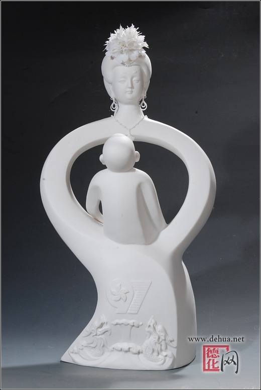 1997年7月1日,香港回歸祖國,一洗百年國恥。陳仁海大師的一款“紫歸牡懷”(子歸母懷)“中國白”作品應運而生。作品選用上乘“中國白”瓷土,構思巧妙,制作精細,作品以母子相擁為基本構圖,線條簡潔,人物生動,寓意深刻,通體潔白如玉,現(xiàn)已成為香港回歸歷史事件的重要藝術珍品。