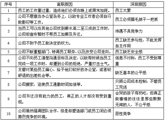 “如果你想穩(wěn)住你的銷量,首先你必須有一支能征善戰(zhàn)而又穩(wěn)定的營銷隊伍。怎樣穩(wěn)住你的隊伍,你得給員工以不走的具有競爭力的理由,也就是說,員工在你這里可以得到什么?美國企管顧問史密斯根據(jù)他多年的顧問經驗,總結出員工離職的十大原因,大致為: