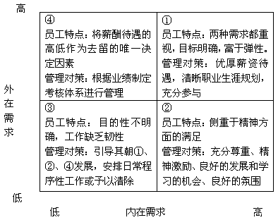 “第四種高外在需求、低內(nèi)在需求的員工看重的是物質(zhì)需求的滿足,這個(gè)時(shí)候薪酬待遇的高低就成為‘激勵(lì)因素’,而工作氛圍、工作環(huán)境、發(fā)展和學(xué)習(xí)的機(jī)會(huì)屬于‘保健因素’,可根據(jù)其工作業(yè)績(jī)制定相應(yīng)考核體系進(jìn)行管理。”