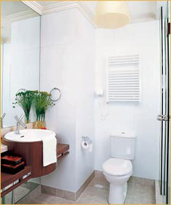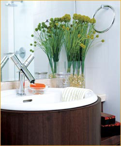 與淋浴間相對(duì)的墻面完全使用了鏡子,擴(kuò)大了小浴室的空間視覺(jué)感,鏡子前面做成了浴室架,上面安裝了臺(tái)式盆,這里可以梳洗打扮,邊上的綠色植物,成了整體設(shè)計(jì)中引人注目的亮點(diǎn),也為環(huán)境帶來(lái)了生氣。