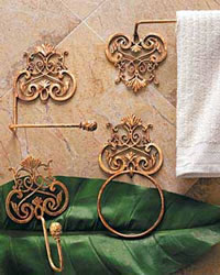 這一組鐵藝毛巾架,給傳統(tǒng)的直線條毛巾架帶來設(shè)計理念上的沖擊。由于鐵藝制品本身的造型,使單一的墻面變得很有生機,而且采用了圓環(huán)、彎鉤、橫檔等多種設(shè)計,可以滿足不同的喜好。當(dāng)然,盡管有一層漂亮的色彩涂層,鐵藝在潮濕的環(huán)境下還是容易生銹,因此在考慮自家衛(wèi)生間的通風(fēng)與除濕條件,或者采用其他金屬材料。