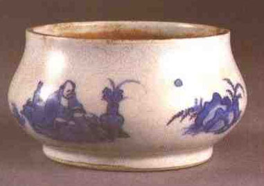 明代晚期天啟至祟禎年間(1621~1644年)景德鎮(zhèn)民窯生產(chǎn)的青花瓷器。萬歷四十八年(1620年)御窯廠停止生產(chǎn)以后,景德鎮(zhèn)民間瓷窯仍很活躍、晚明青花大多數(shù)是民窯即不署年款的瓷器,有少數(shù)作品如“天啟年制”款青花瓶等—類作品,可能是御窯廠的窯工還在繼續(xù)生產(chǎn),明朝社會動蕩不已,官窯署款,民窯不署款的慣例有些并不嚴(yán)格遵守。當(dāng)時社會各階層對青花瓷器的需求量較大,瓷器外銷也很活躍,官府限制松弛,從而使民間作坊得到發(fā)展生產(chǎn)的良機。晚明青花瓷器產(chǎn)量很大,青花鈷料有3個來源:衢州、信州的浙科、江西上高的邑青和豐城的粗料。器物大多是日用品,少數(shù)是陳設(shè)藝術(shù)品。裝飾花紋內(nèi)容很多,減少了官窯器純粹表達皇帝意志的規(guī)范圖案,出現(xiàn)了活潑的草蟲圖如蟋蟀、飛蝶,各類動物紋如牛、羊、虎、貓、魚、嚇、鸚鵡、鷺鷥等,還有人物戲曲故事、山水景物、庭園小景等。這些畫面多配以題畫詩,繪畫內(nèi)容、意境和筆法與當(dāng)時的文人水墨畫風(fēng)格一致,都著意表現(xiàn)士大夫階層在政治上失意、寄情山水田園的隱逸思想。由于廣泛采取分水和暈染技法,多有大寫意的情趣,面面開闊,筆意瀟灑酣暢,鈷料雖粗,著筆不多,但藝術(shù)效果不凡,有些繪畫筆法,如用青花點染太陽,具有明顯的時代特征。晚明青花藝術(shù)風(fēng)格的漸變,為清代青花瓷的勃興奠定了基礎(chǔ)。流傳到日本的“古染村”、“祥瑞”瓷,以及遠銷歐亞各國的“芙蓉手”,很多都是晚明天啟、崇禎年間景德鎮(zhèn)生產(chǎn)的。(見下圖)