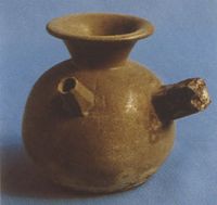 說 明: 胎質(zhì)灰白,質(zhì)地堅密.通體施青黃釉.此壺器型很小,與藥碾等伴出,是一種溫藥用具.