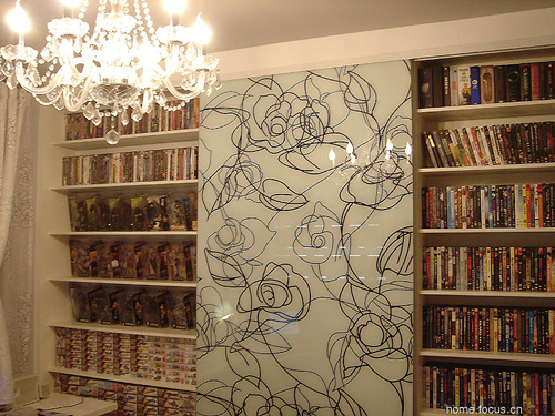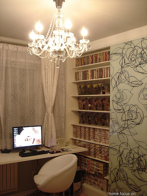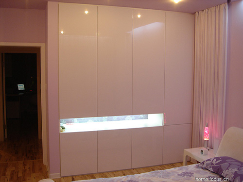 自己設(shè)計(jì)的衣柜,中間的鏤空處貼的紋樣壁紙和電視墻呼應(yīng) 換個(gè)角度