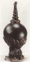 說 明: 瓷質(zhì)堅(jiān)致,釉色晶潤(rùn),通體漆黑光亮.紋飾采用捏塑,模制,貼花等手法.造型奇特,制作精美,裝飾華麗,為耀州窯黑釉瓷的精品.
