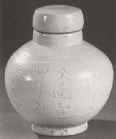 說 明: 胎厚質白微泛黃,釉薄色泛青.定瓷刻字記事,是北宋初期定州民窯承做的典型作品.