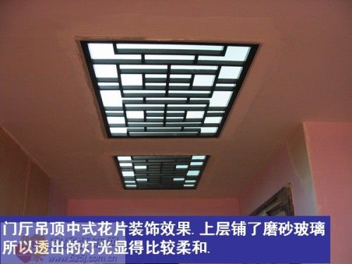 門(mén)廳吊頂不是例常單一的燈具,而是鑲嵌在吊頂里面的中式花片式的吊燈,而磨砂的玻璃,更讓這款吊燈顯得有古代窗欞的感覺(jué),而本身的造型,就有點(diǎn)像古房中的天窗,只是這個(gè)天窗非常具有中式的風(fēng)格。