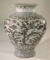 說 明: 胎體厚重,造型雄健.白釉,釉下用銅紅料繪畫紋飾.紋飾雖層次繁多,但主次分明.畫意澹遠(yuǎn)雅潔,為洪武時(shí)珍品.