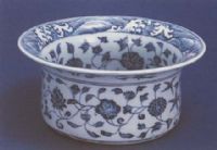 說 明: 釉光滑細潤.蘇麻離青料繪飾.青花呈色濃艷,畫筆生動,為永樂時期的新造型,系受西亞文化影響而制.原為宮廷舊藏.