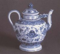 說 明: 全器青花紋飾,以纏枝蓮花紋為主.款識(shí)位置特殊,書于流部的青花長(zhǎng)方形雙欄內(nèi),楷書"大明宣德年制"款.造型新穎.