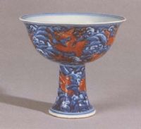 說(shuō) 明: 此杯在釉下以青花海水作為地色,釉上用礬紅料染繪海獸,波濤洶涌,怪獸奔馳,構(gòu)圖十分新穎.是宣德青花加彩器中的杰作.