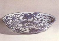 說 明: 盤形制較大,制作規(guī)整.胎質(zhì)細潤,釉質(zhì)晶瑩肥厚.獅子體態(tài)靈活輕盈,形象自然生動,構(gòu)圖布局合理.青花色澤濃艷,濃艷處基本無鐵銹斑點,這在同期的青花器中較為少見.