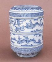 說(shuō) 明: 盒體為燈籠式三層套盒,器身垂直.全器紋飾構(gòu)圖層次清楚,青花色澤晦暗,近乎淡描,釉質(zhì)瑩潤(rùn),為正德青花瓷器.