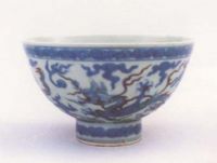 說 明: 此碗在青花紋飾上加飾紅綠彩,使器物色彩更顯濃郁,表現(xiàn)出一種新的格調(diào).碗底足內(nèi)有青花雙圈"正德年制"款.
