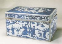 說 明: 造型渾厚.紋飾中人物身材修長,姿態(tài)飄逸.青花色澤艷麗.底楷書"大明隆慶年造"兩行六字款.盒是隆慶時期燒造的新形制,品種多樣.