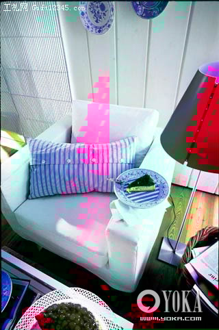 4.青花瓷盤也可以用高強度的粘貼劑貼在墻上作為裝飾,與藍白細(xì)條紋靠墊在色彩上有所照應(yīng),紅色燈罩的落地?zé)糇鳛辄c睛之筆,為整個休憩區(qū)更添明快時尚的氣質(zhì)。
