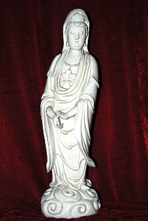“茴江山人”款祥云觀音,潔白如玉,栩栩如生,臨立祥云之上,昂首凝視人間,盡顯觀音慈愛悲憫之心境。